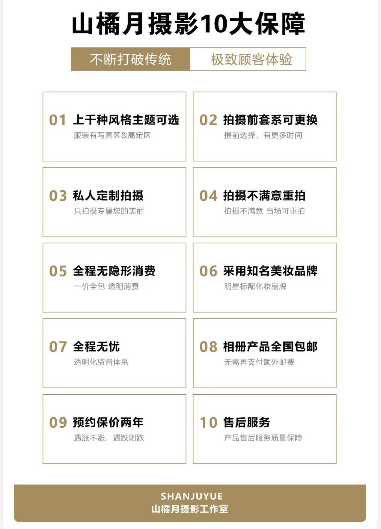此外,合肥山橘月摄影还秉持真诚、有爱、创新的价值观,将十大保障贯穿服务全程,包括一价全包无隐形消费、拍摄不满意当场重拍、预约保价两年、相册全国包邮等,切实保障客户权益。
